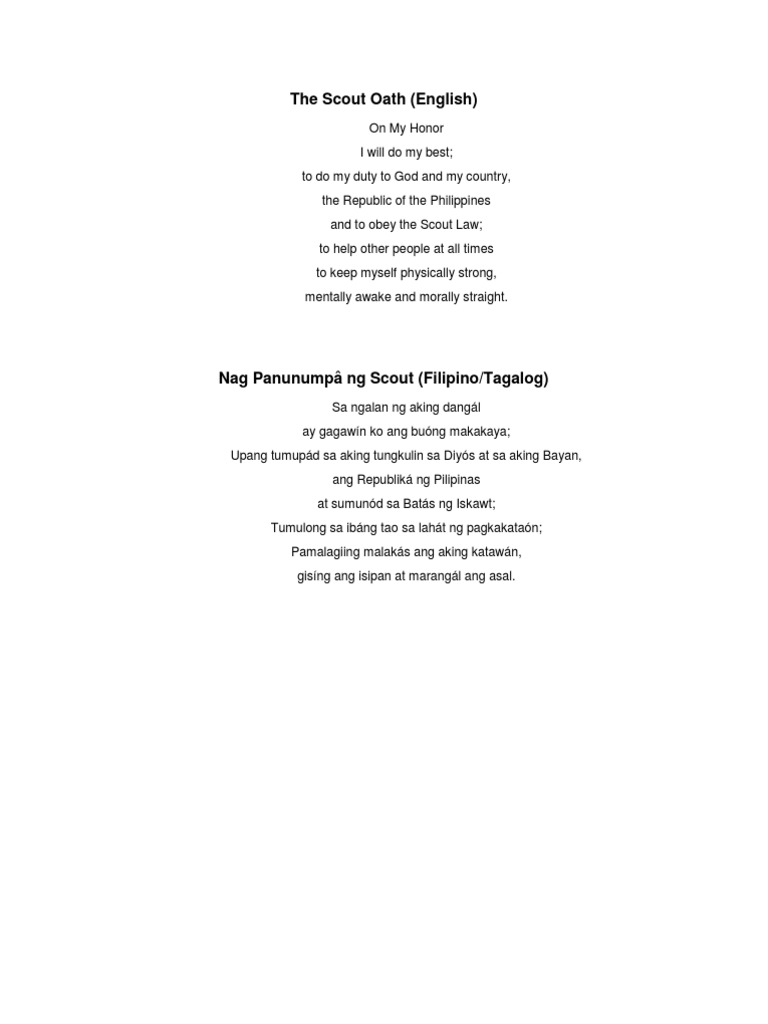 To help other people at all times. Web Scout Oath Laws Scout Oath Law Motto and Slogan Boy Scout Oath or Promise On my honor I will do my best To do my duty to God and my country and to obey the Scout. Web Boy Scout Oath or Promise On my honor I will do my best To do my duty to God and my country and to obey the Scout Law.